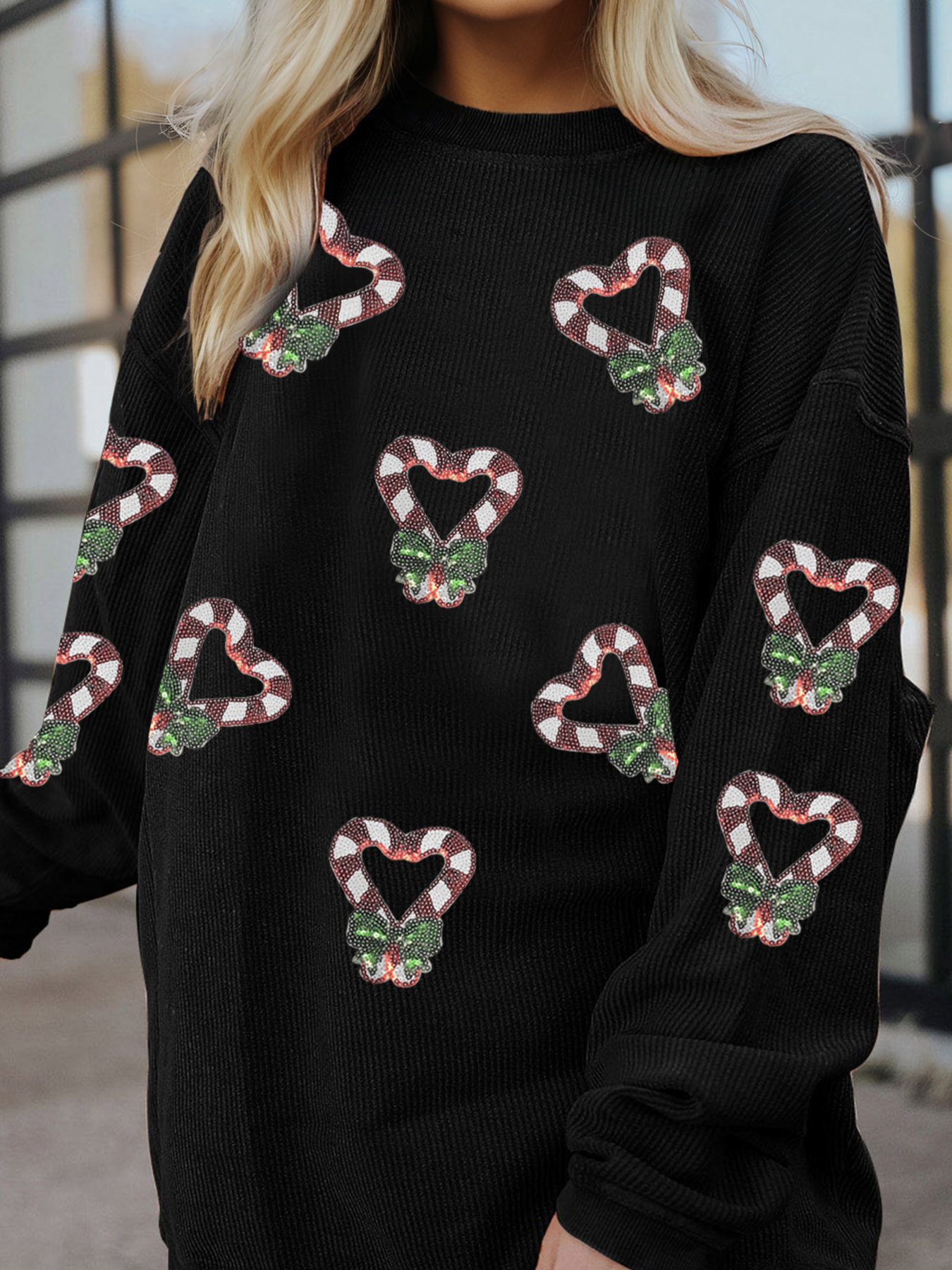 Sequin Christmas Candy Cane Heart Graphic Drop Shoulder Ribbed Sweatshirt