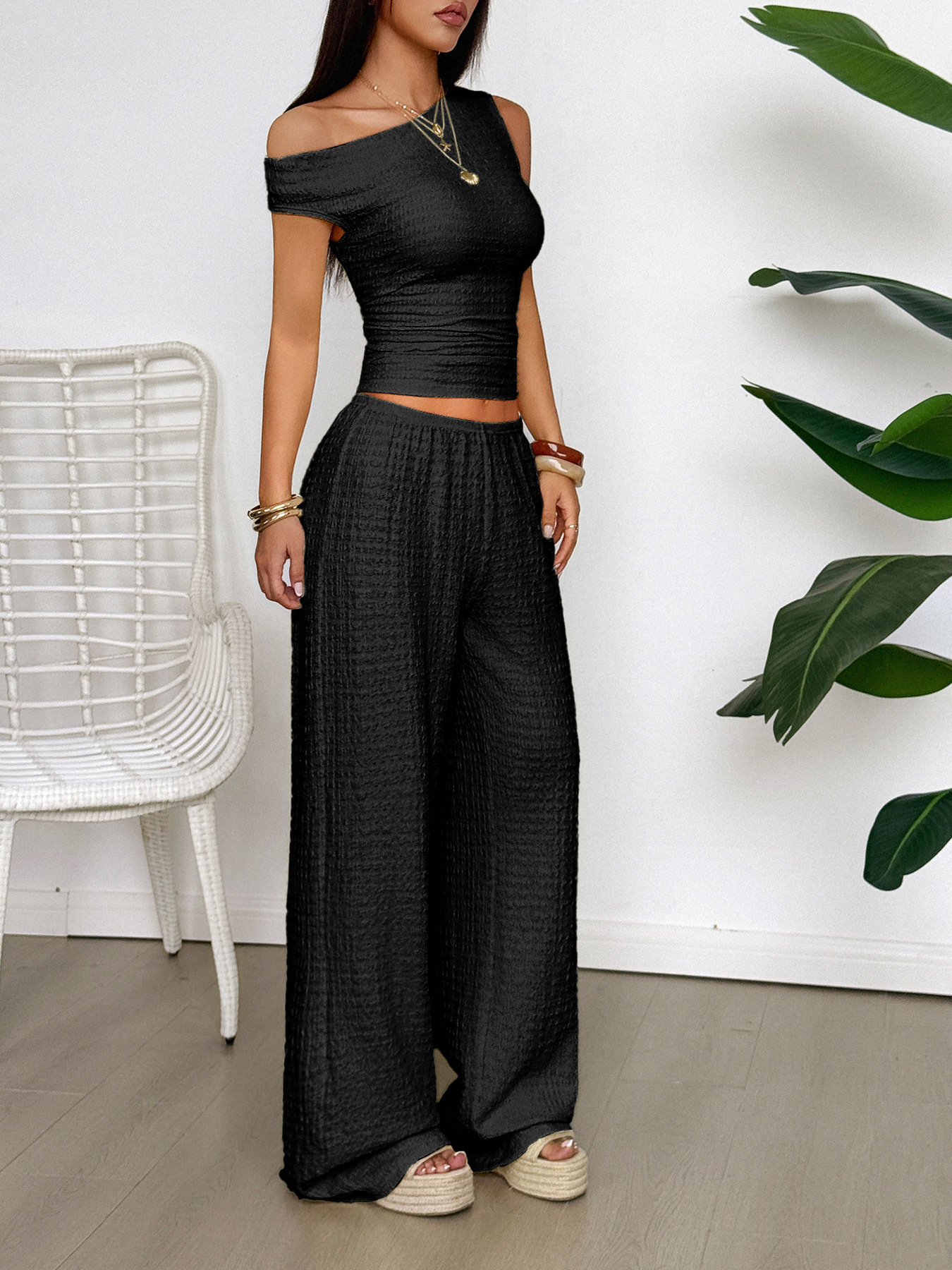 One Shoulder Top And Wide Leg Pants Set