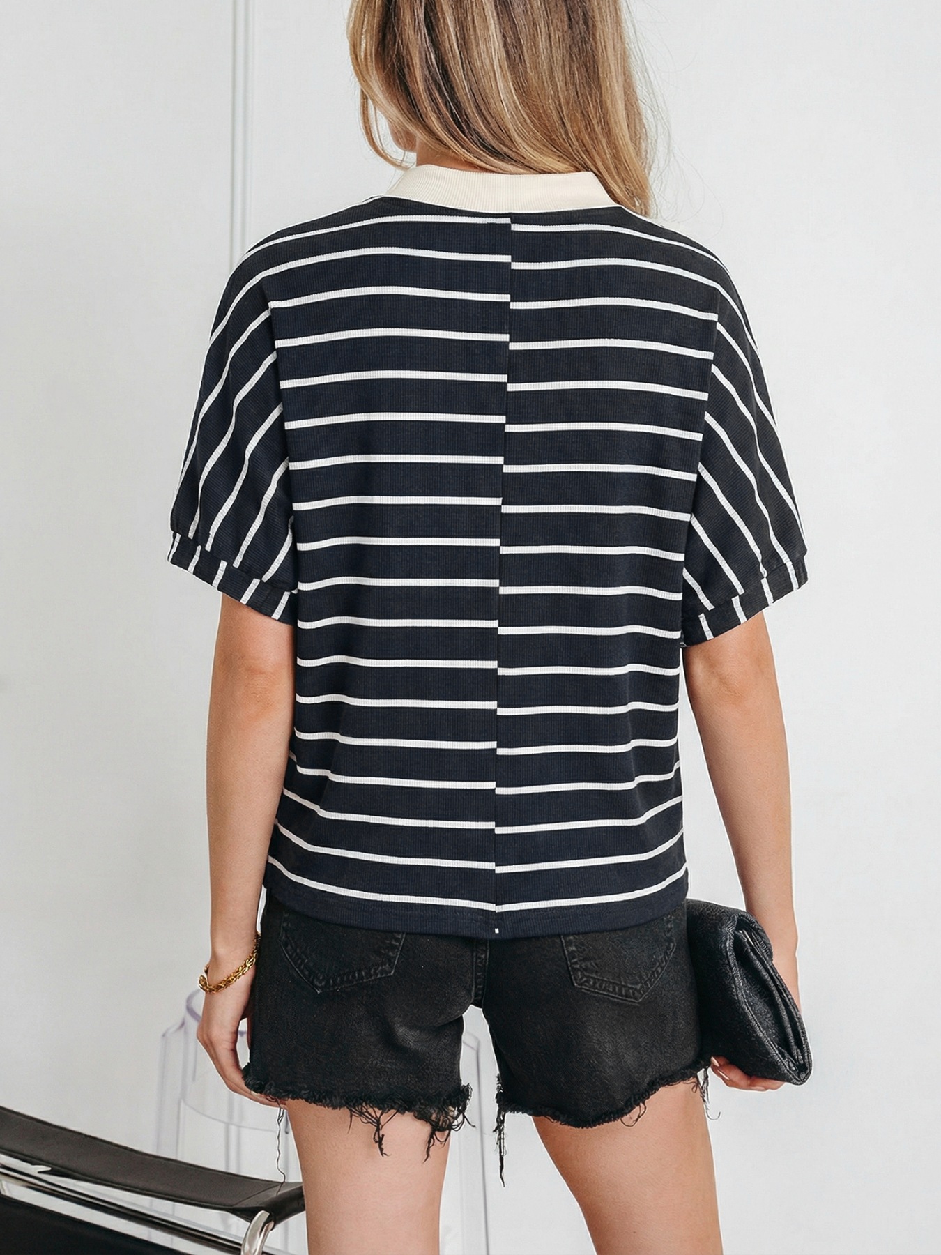 Stripe Stand Collar V Neck Elastic Cuffs Half Sleeve Dolman Top