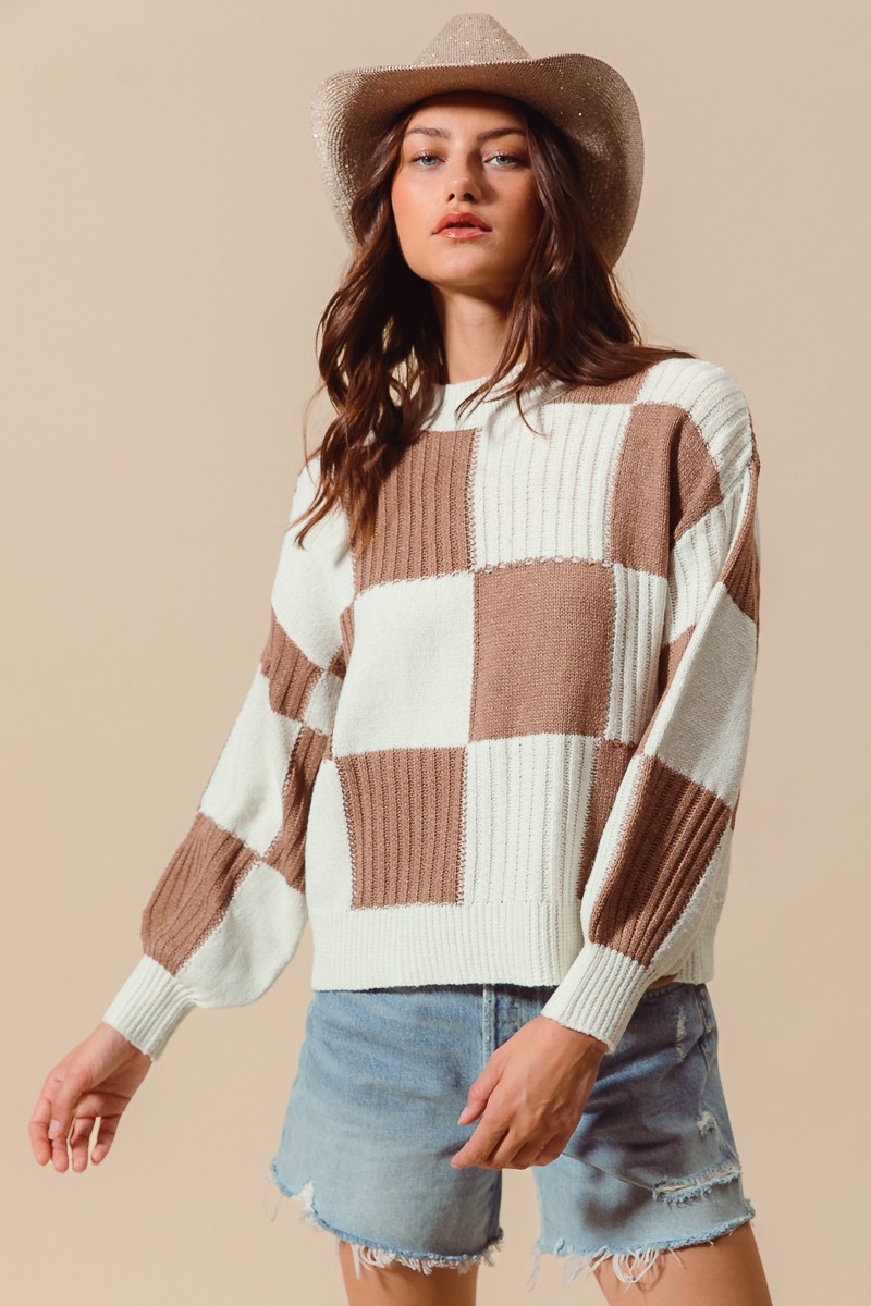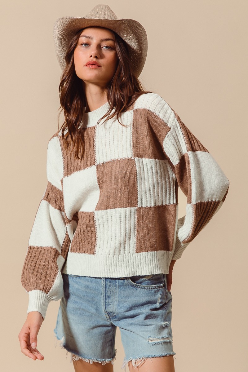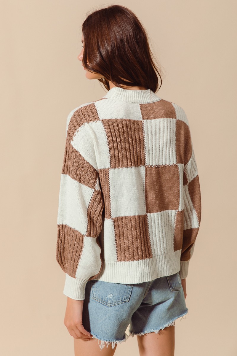 So Me Ribbed Color Block Checkered Plaid Sweater