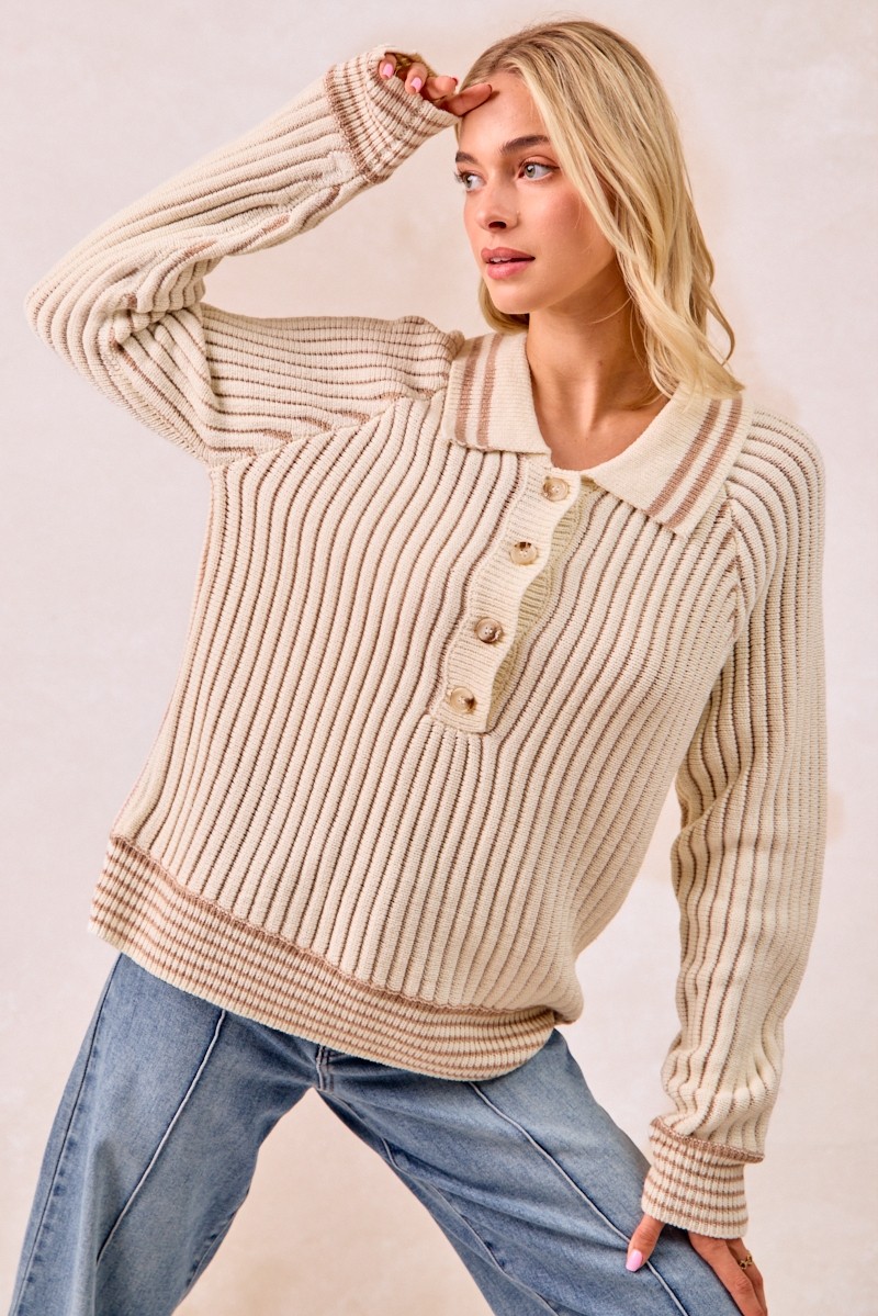 Bibi Half Button Ribbed Two Tone Sweater
