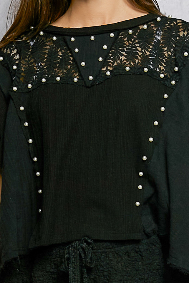 Pol Lace Pearl Stud Round Neck Short Sleeve Shirt