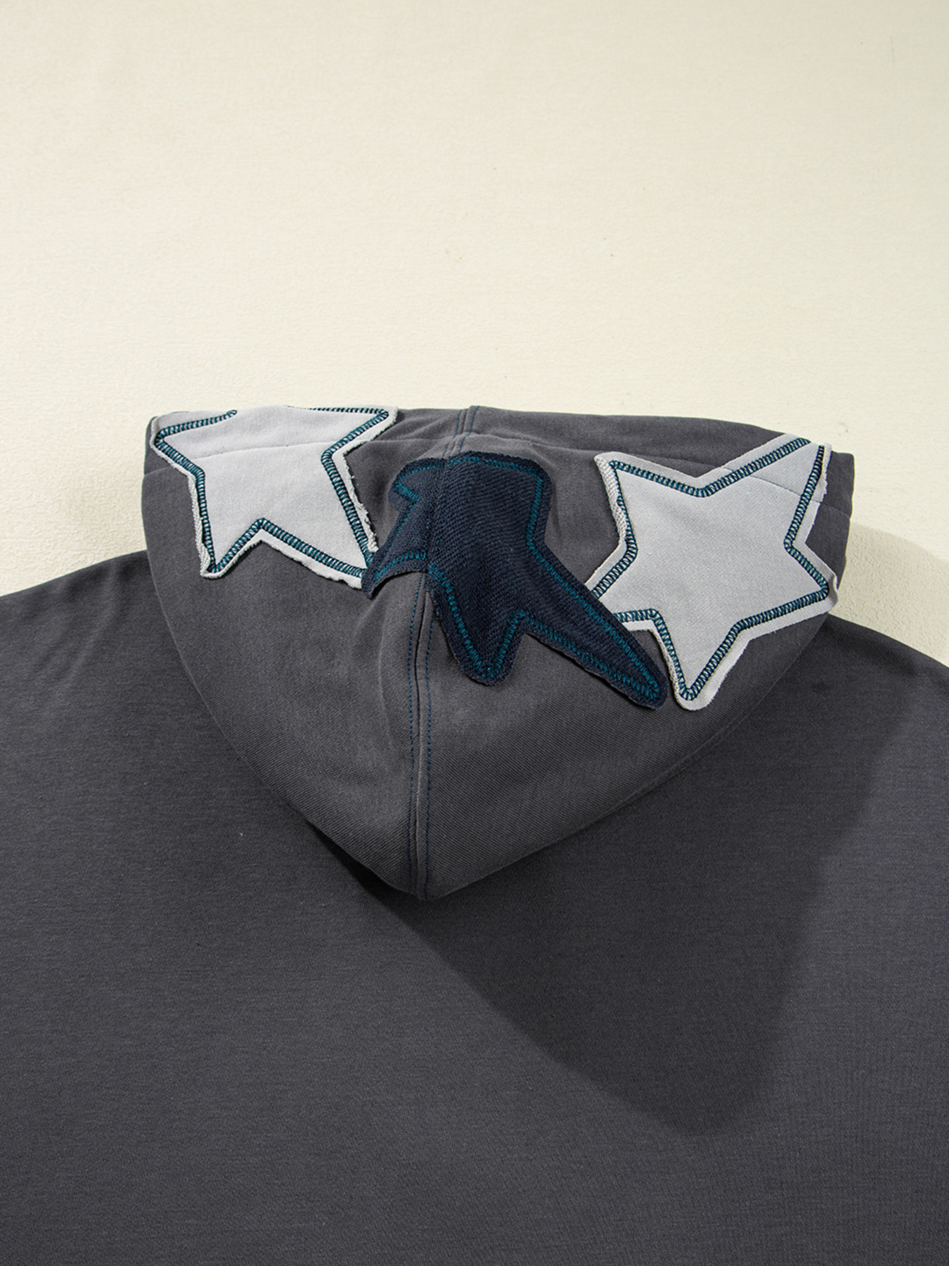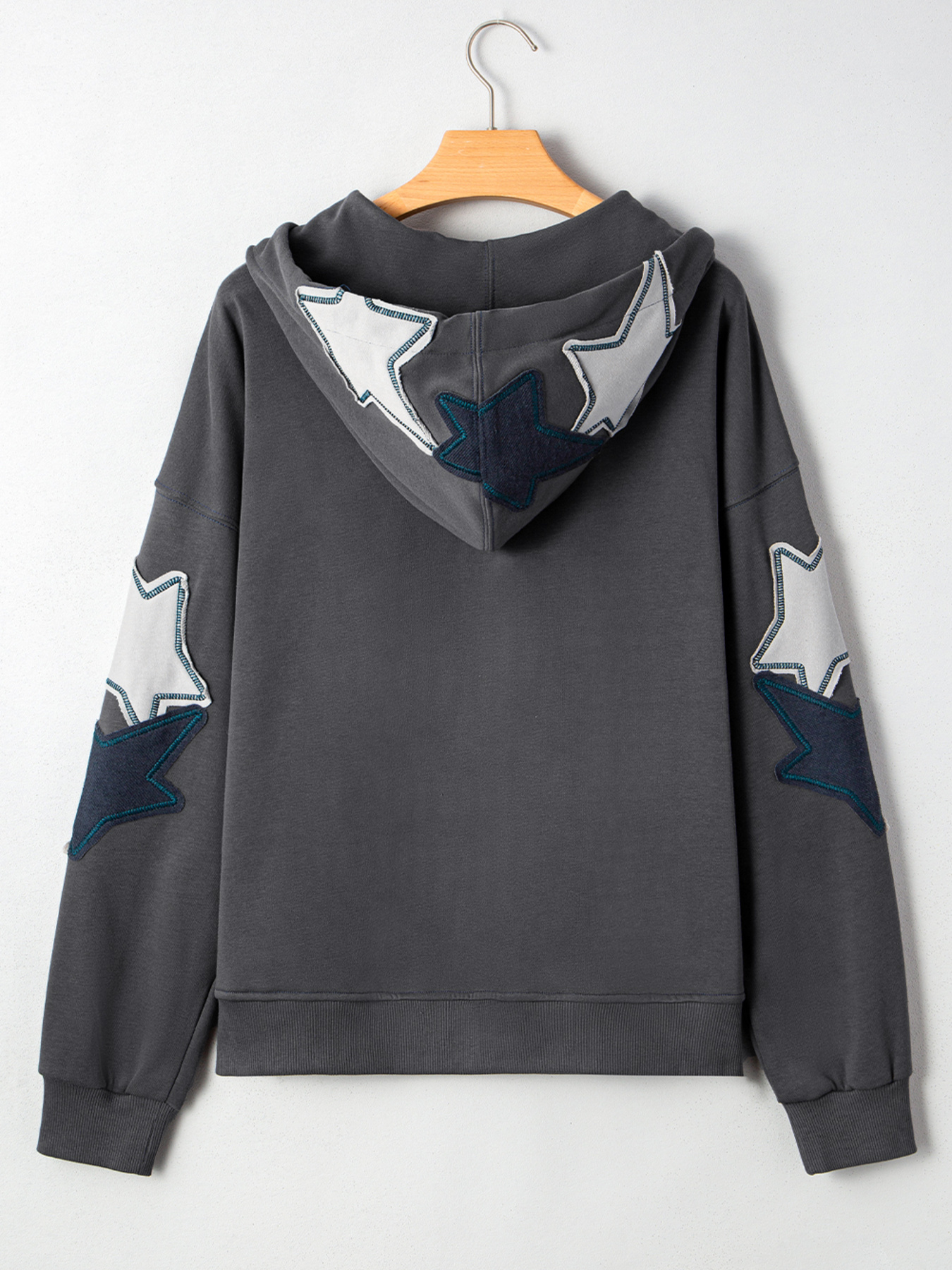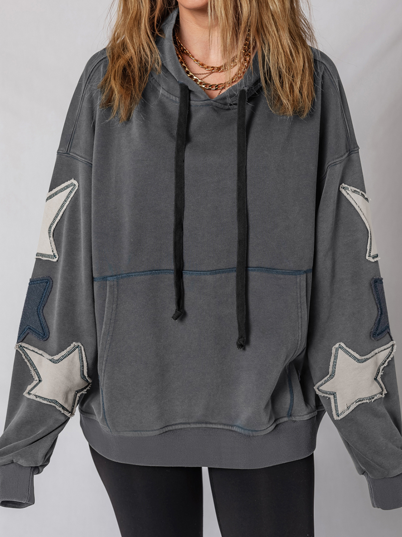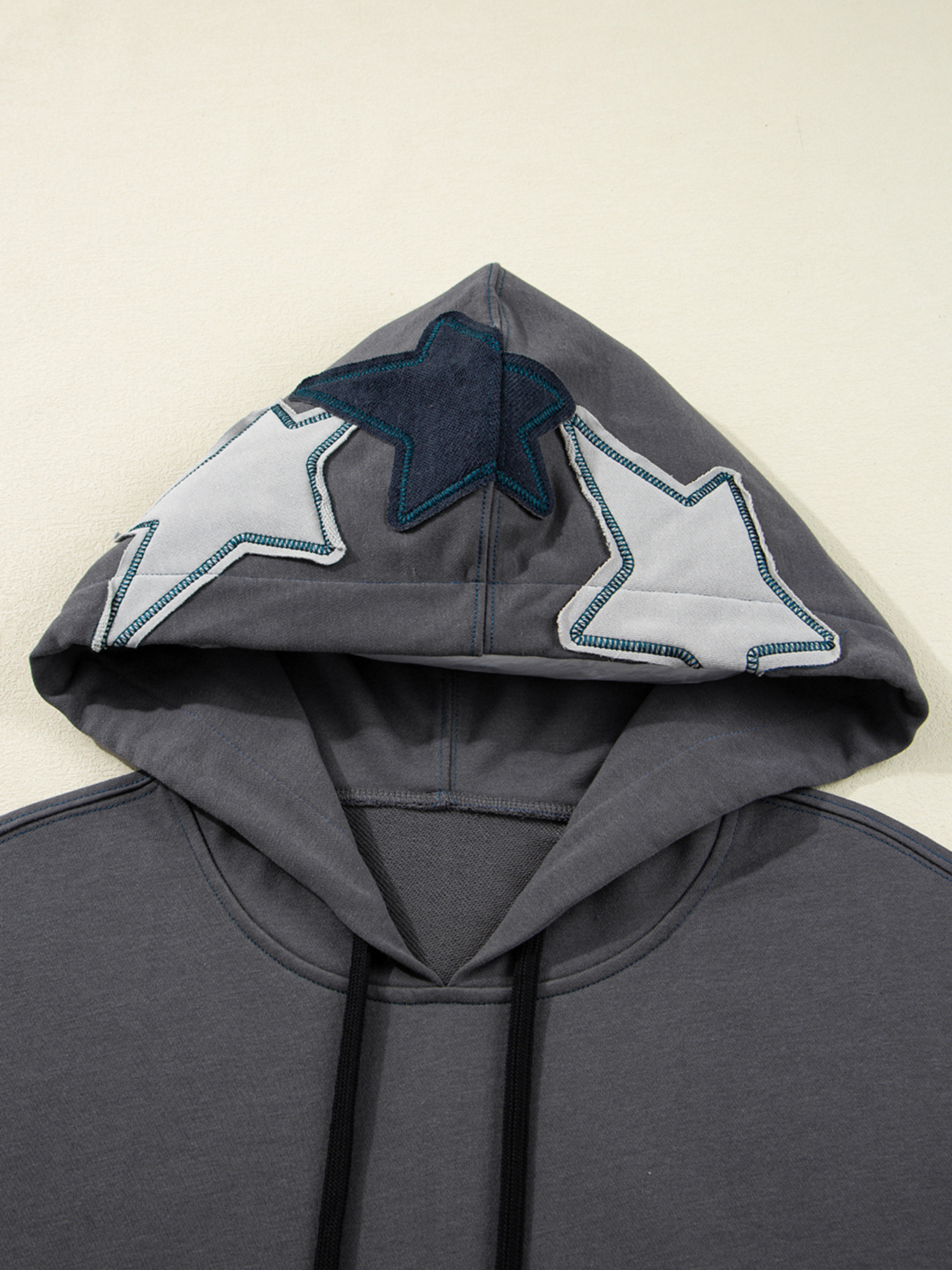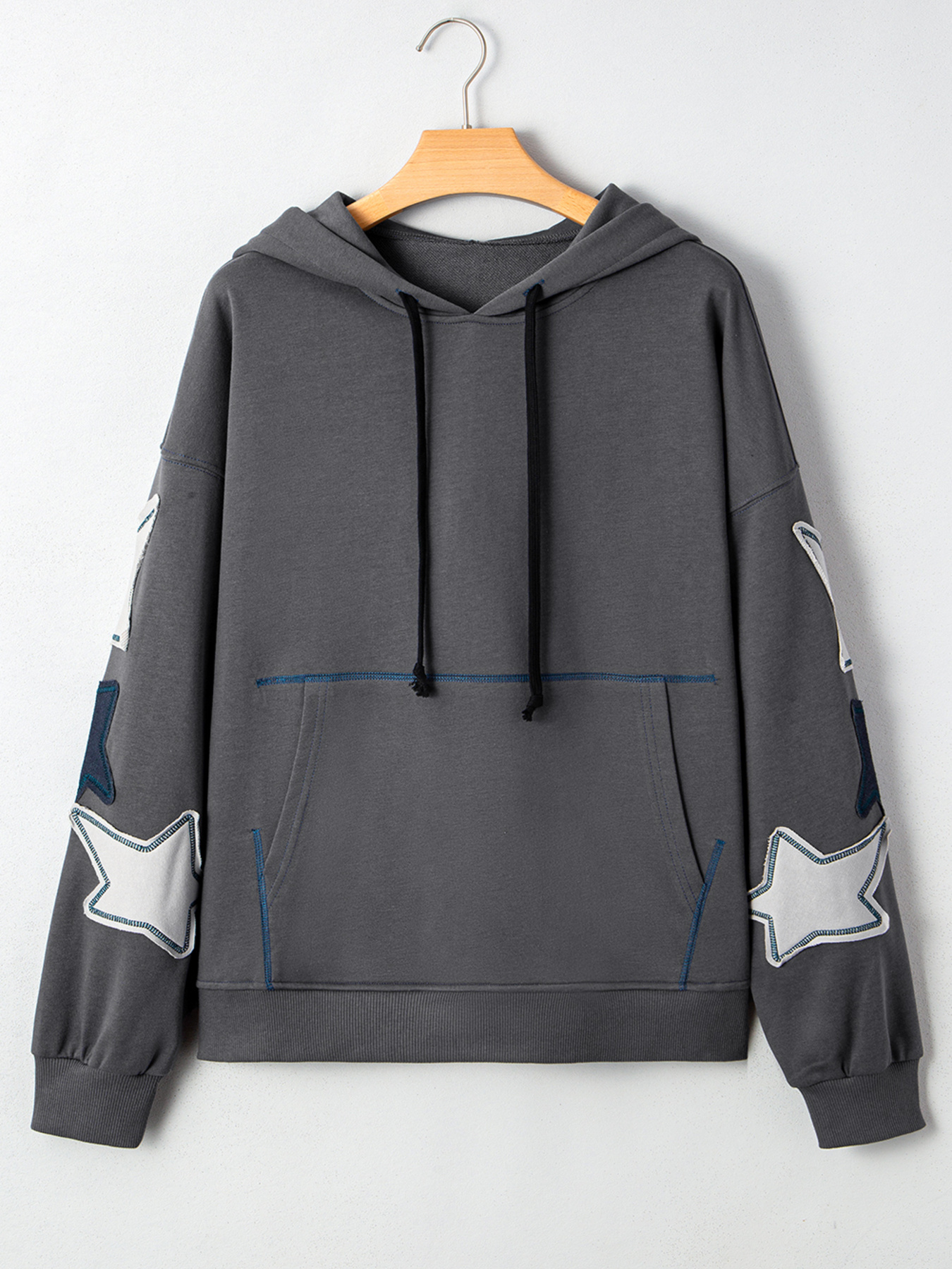 Star Patchwork Contrast Stitching Mineral Wash Kangaroo Pocket Hoodie