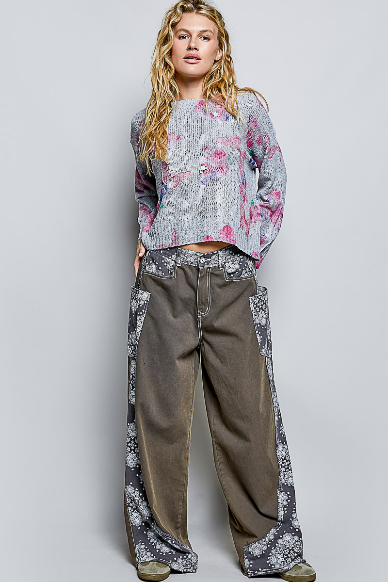 Pol Ribbed Butterfly Print Round Neck Knit Top