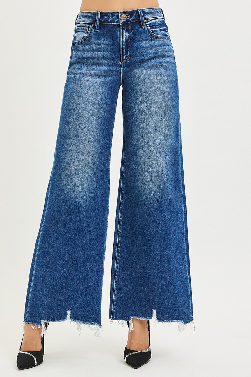 Risen High Rise Wide Leg Jeans With Distressed Hem